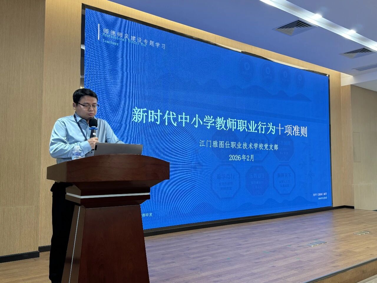 随后,学校党支部书记许昌组织全体教职工开展师德师风专题教育,带领学习《新时代中小学教师职业行为十项准则》等文件精神,结合典型案例开展警示教育。强调师德师风是教师立身、育人之本,要求教职工坚守教育初心、恪守规范,关爱学生、尊重差异,杜绝违规违纪,树立良好形象。同时,部署新学期德育工作,明确以思想政治教育为核心,抓实常规管理,丰富活动载体,加强家校社协同,强化队伍建设,将德育融入学生成长各环节,培育德技并修的新时代技能人才。