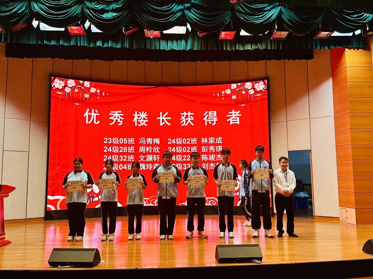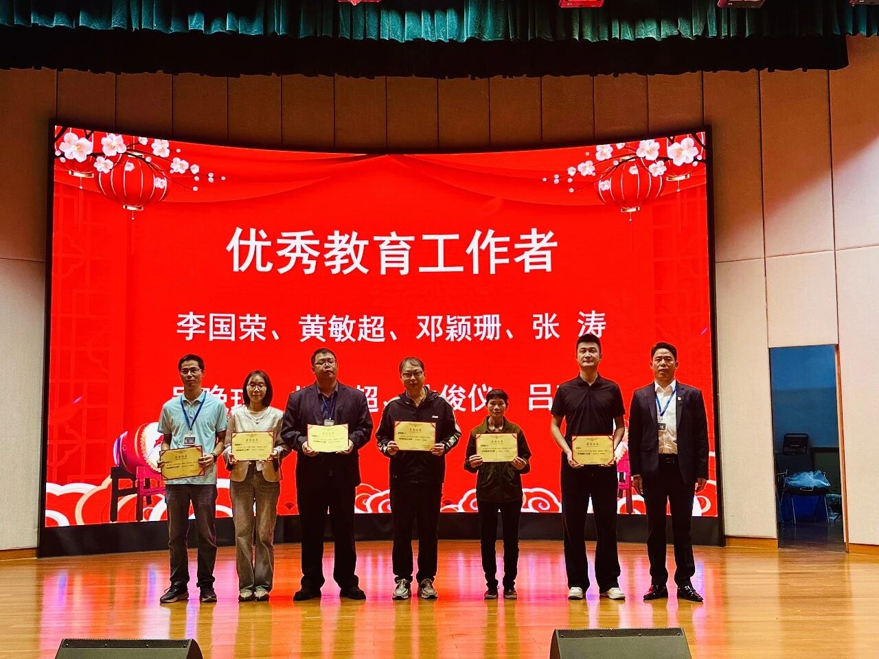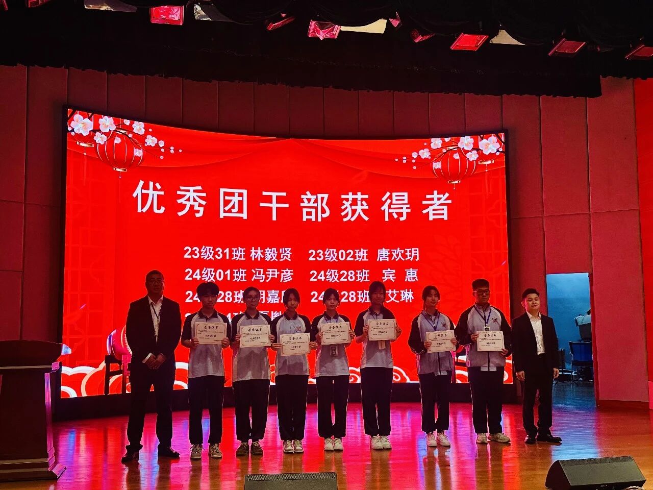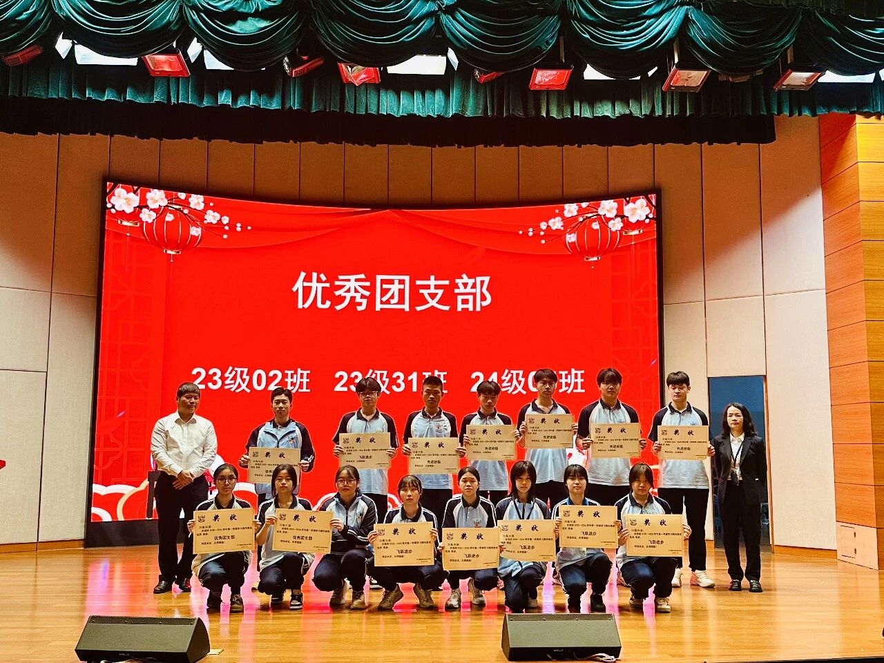 典礼现场举行隆重的表彰环节,学校依次为优秀团干部、优秀团员、优秀学生干部、优秀楼长及先进班级、优秀团支部、飞跃进步班级颁奖;同时表彰上学期优秀教育工作者、优秀班主任、优秀教师,并为取得心理健康C证的教师颁证。一批品学兼优的学生与爱岗敬业的教职工受到表彰,榜样力量激励全体师生奋勇争先。典礼结束后,各班有序观看广东省教育厅“开学第一课”直播。