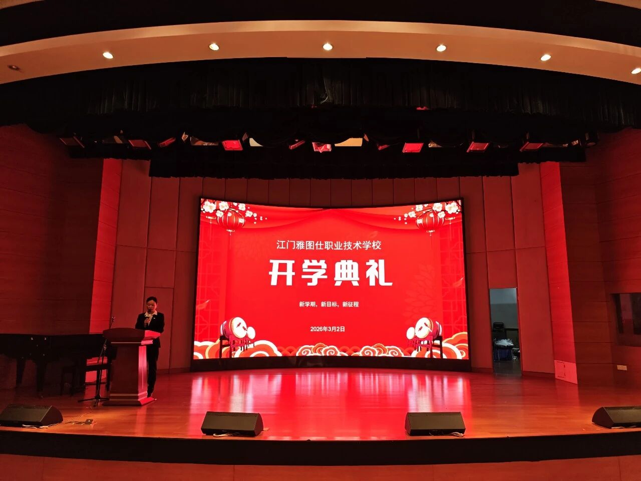 春风送暖,万象更新。为开启新学期新篇章,凝聚师生奋进力量,3月2日上午,江门雅图仕职业技术学校2026年春季开学典礼隆重举行。本次典礼由学校德育处副主任何小芳主持,校长胡大强、党支部书记许昌、副校长李超锋等领导和全体师生参加。